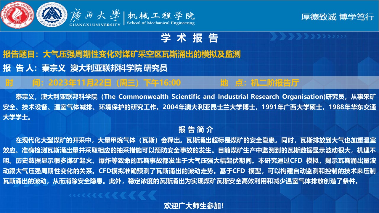 【机械工程学院学术报告】 大气压强周期性变化对煤矿采空区瓦斯涌出的模拟及监测