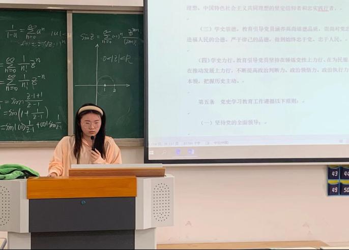 为深入学习习近平总书记关于党纪学习教育的重要讲话、指示精神,推动党史学习教育常态化、长效化,进一步加强学生党员党性修养,引导党员干部绷紧纪律之弦、常存敬畏之心,教育学院汉语言文学专业学生第一、第二党支部于5月29日中午在2教323室开展了“学党纪明规范担使命展作为”党纪学习教育。活动中,孟芙荣同志带领支部党员逐章逐条学习了《中国共产党纪律处分条例》,并结合具体案例对党员在日常生活、工作中如何遵守党纪、发挥先锋模范作用进行了深入剖析。