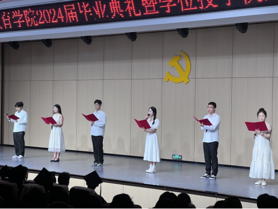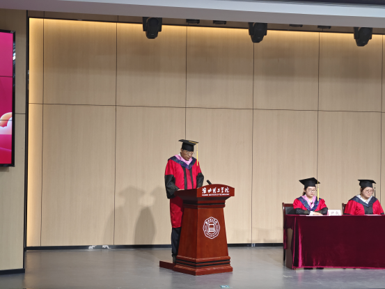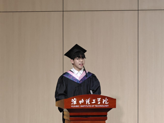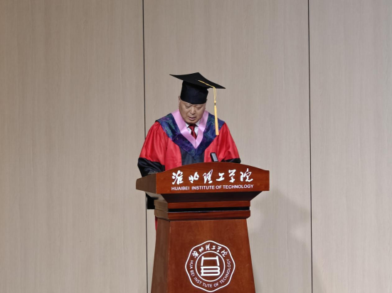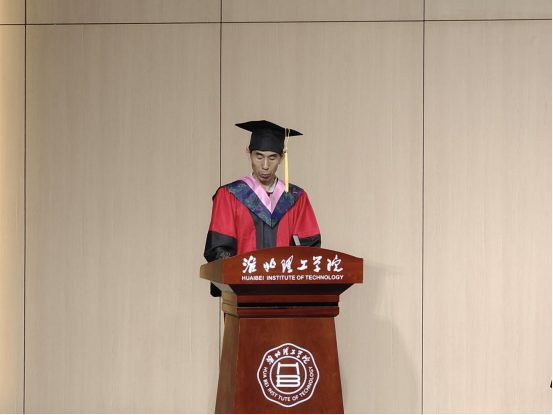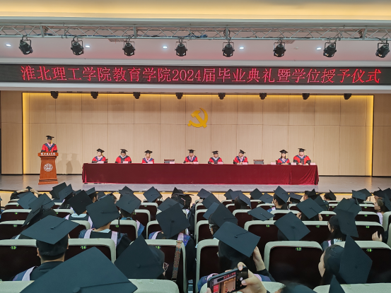 毕业典礼在雄壮的国歌声中拉开帷幕,副院长谢贤德宣读了《淮北理工学院2024届本科毕业生学士学位授予决定》后,出席仪式的领导和教研室主任分别为毕业生代表颁发学历、学位证书,并进行拨穗正冠与合影留念。