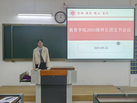 为加强新生班级组织建设,提升学生干部的综合能力与责任意识,确保学院各项工作有序推进,9月24日下午,教育学院于1号教学楼114教室组织召开2025级学生班长、团支书会议。本次会议由教育学院团总支书记许海涛主持,教育学院分管副书记孟向红、全体2025级班长及团支书参加。