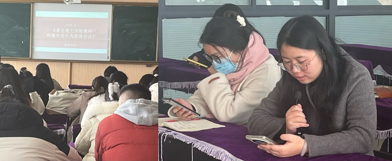 教研室副主任郗佩佳组织学前教育教研室教师对《淮北理工学院师德失范行为处理办法》进行了详细解读和学习。该办法明确了师德失范行为的定义、处理原则、处理程序以及处分种类等,为规范教师职业行为、维护学校正常管理秩序提供了有力保障。通过学习,教师们对师德师风建设的重要性有了更加深刻的认识,纷纷表示将自觉遵守教师职业道德规范和行为准则,坚决抵制任何师德失范行为。