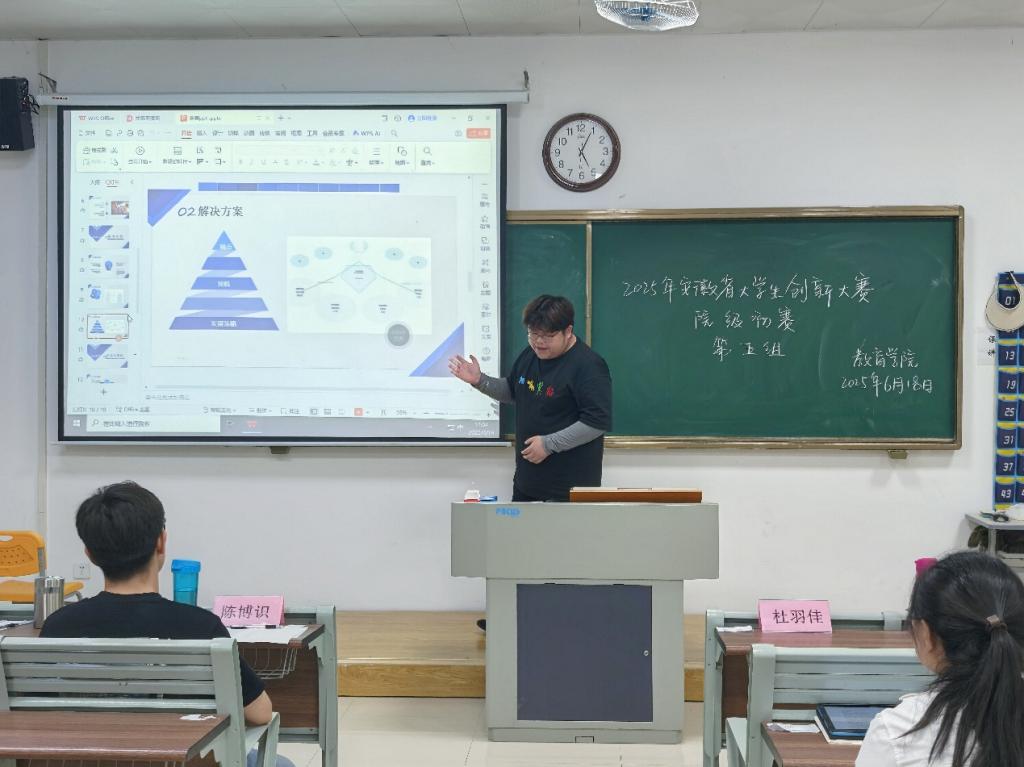 为落实国家创新创业教育部署,提升学生创新实践能力。6月18日,教育学院2025年大学生创新大赛院级初赛在1号教学楼111、112、113、114、115、116等六个教室同步进行,各赛场评委由学院专任教师担任。本次大赛共有89支队伍参加线下比赛。