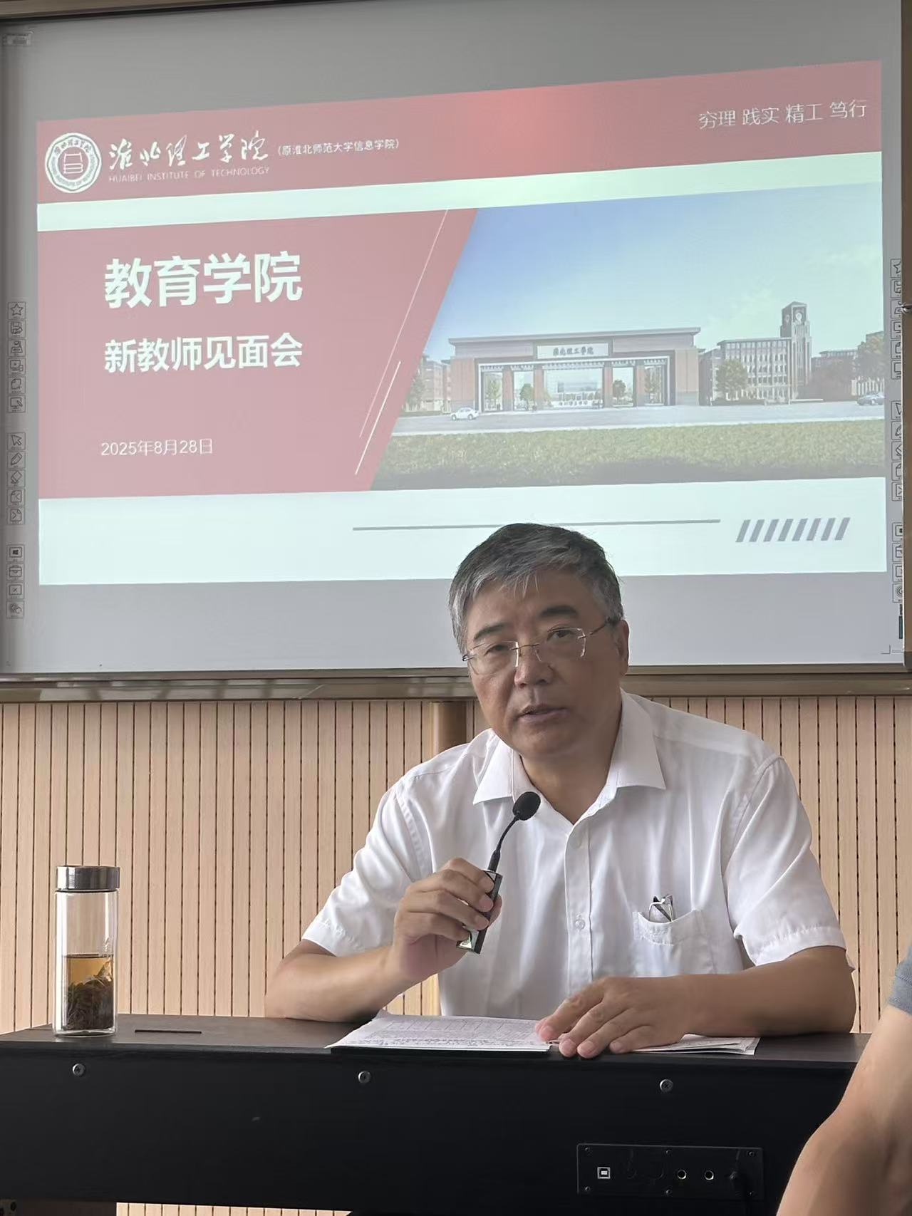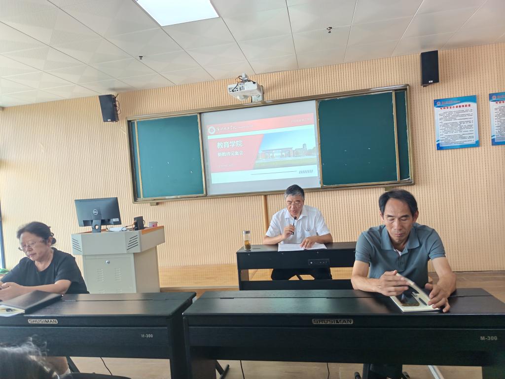 2025年8月28日,淮北理工学院教育学院新入职教师见面会在艺术楼301室顺利召开。教育学院院长王家云、副院长孟向红、谢贤德、院长书记助理和教研室主任出席会议。新入职4位银龄教师和42位青年教师参加会议。与会领导介绍学院基本情况后,教研室主任带领新入职教师参观了教师工作室并就开学前的各项准备工作进行了沟通与交流。会议由副院长谢贤德主持。