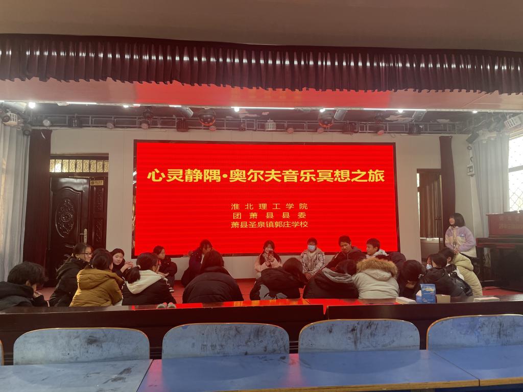2024年12月27日,一场意义非凡的奥尔夫音乐冥想活动在 萧县郭庄中学热烈举行,本次活动由淮北理工学院牵头,联合萧县团县委共同举办,为全校师生带来了一场独特而深刻的心灵与音乐交融的盛宴,在校园中引发了广泛关注与强烈反响,掀起了一股关注学生心理健康与艺术素养培育的热潮。