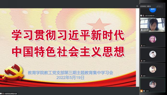 5月19日中午,教育学院教工党支部为了学习贯彻习近平新时代中国特色社会主义思想主题教育,开展第三期读书班集中学习会,本次学习会以“线上课堂”形式举行,由教工党支部委员邵和君同志主持并领学。