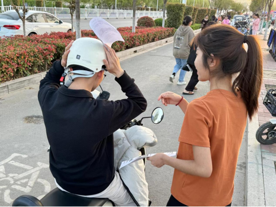 为了践行新时代文明实践志愿服务精神,助力校园交通安全保障工作,4月17日下午,教育学院教工第一支部入党积极分子开展了“一盔一带”安全守护行动。