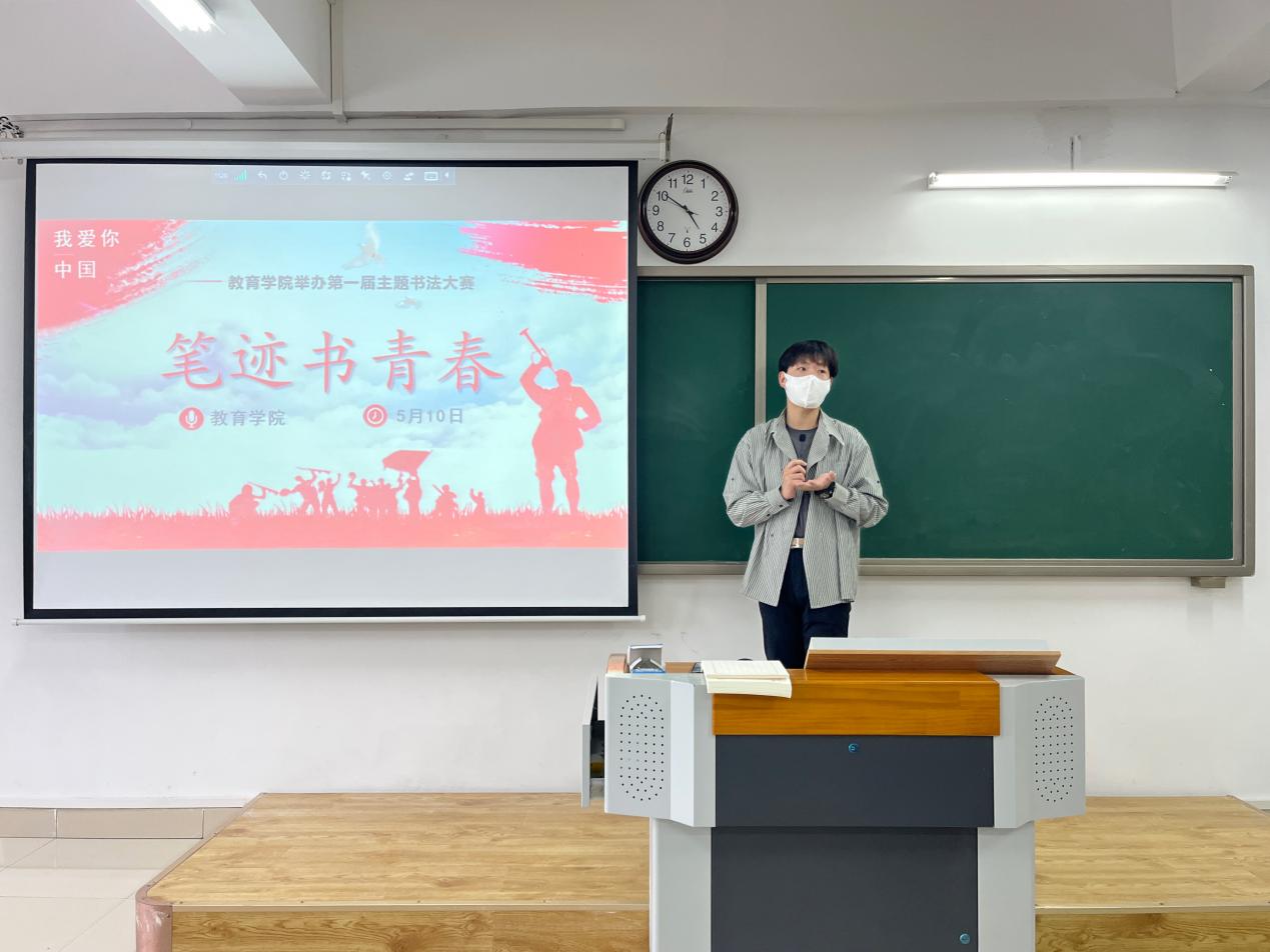 为深入学习贯彻党的二十大精神,增强文化自信,感受中国书法的艺术之美和传统文化的独特魅力,展现当代大学生的文化和技能素养。5月10日下午,教育学院举办第一届“笔迹书青春”主题书法比赛,辅导员郭鸿鑫老师主持了开幕仪式,学院共285名同学报名参加,其中硬笔书法在1号教学楼520室和521室开展,软笔书法在1号教学楼514室开展,黑板粉笔字在1号教学楼308、309等19个教室开展。本次比赛以“新时代爱国青年”为主题,设有硬笔、软笔、黑板粉笔三个项目,参赛选手现场在40分钟内完成对一段指定内容的书写。