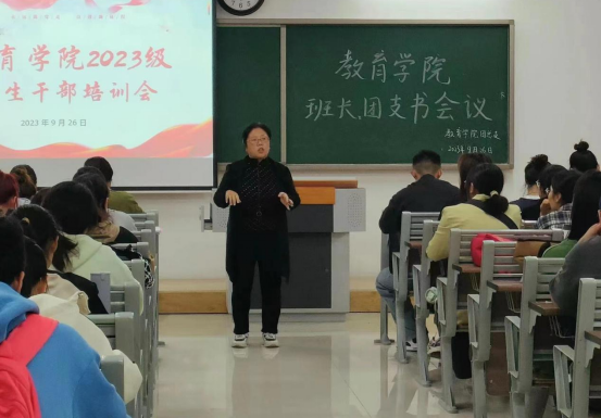 为进一步强化学生干部队伍建设,发挥学生干部模范带头作用,促进学院学生管理工作的有序开展,9月26日下午,教育学院在1号教学楼520教室召开2023级学生班级班长、团支书培训会。学院分管副书记孟向红、书记助理黄莹莹、团总支副书记许海涛、2023级全体辅导员以及2023级全体班长、团支书参加了本次培训会。