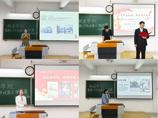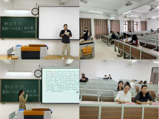 教育学院暑期开展三下乡社会实践活动,旨在锻炼学生社会实践能力,9月27日下午,教育学院于2号教学楼415教室、416教室、417教室举办三下乡成果汇报比赛,由23级辅导员老师担任评委,各实践团队同学参加。