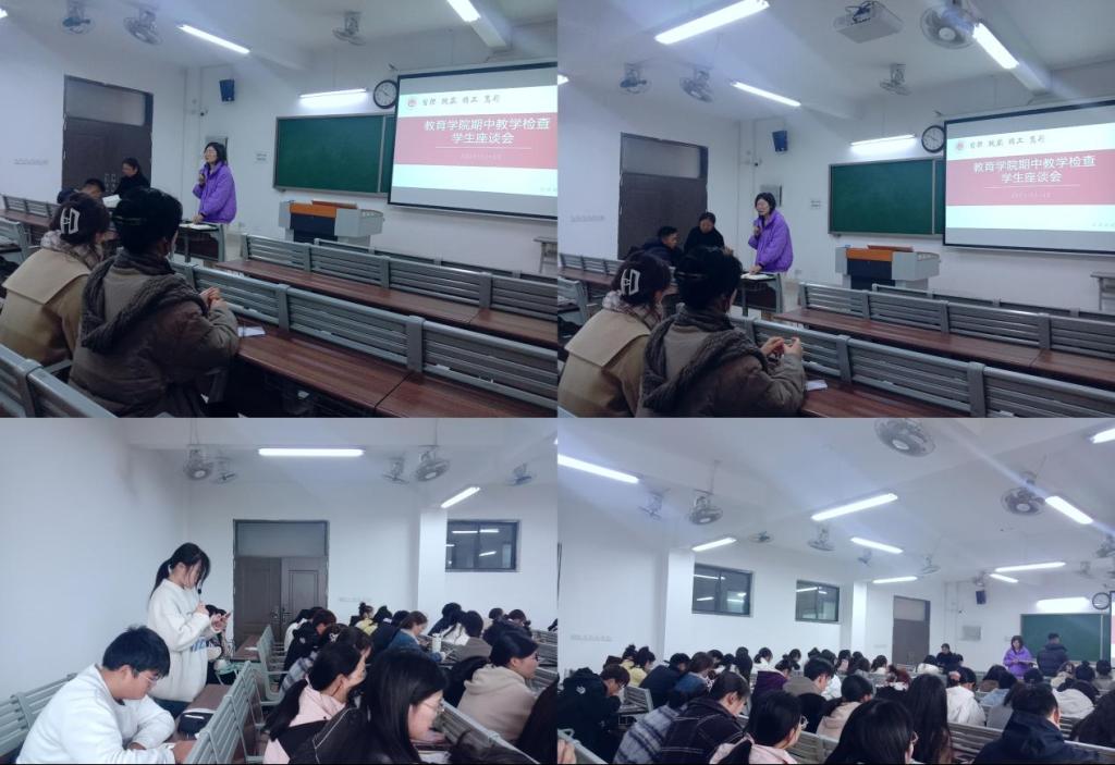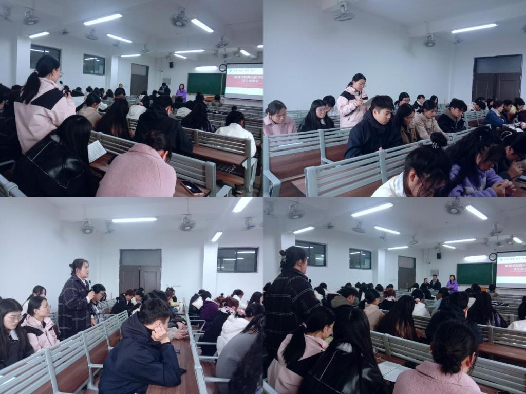 按照学校“关于开展2023-2024第一学期期中教学检查的通知”精神,教育学院于11月15日下午在1号教学楼41O、411教室分年级召开了学生座谈会,倾听同学们对教学的意见和建议。学院分管副书记孟向红、书记助理黄莹莹、团总支副书记许海涛、辅导员郭鸿鑫、高伟参加会议,黄莹莹、许海涛分别主持了会议。