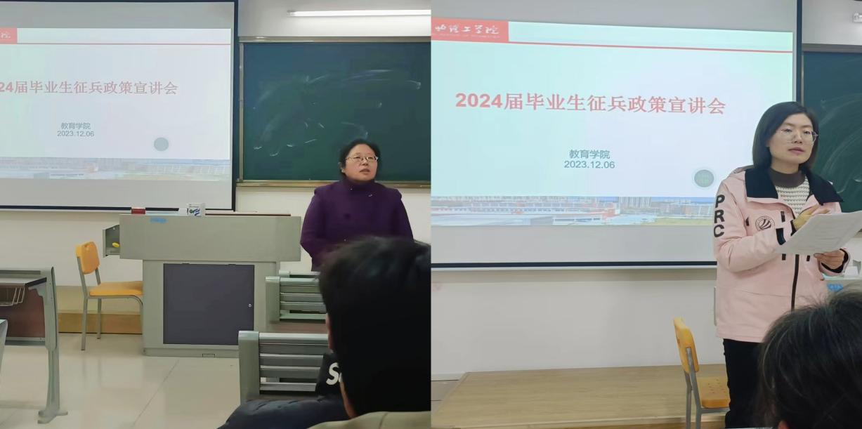 “国无防不立,民无防不安”,为增强广大青年学子的国防意识、建立良好的国防素质、深化爱国主义思想,充分发挥退役大学生军旅经历优势,营造高校爱国拥军良好氛围,教育学院于12月6日下午,在1教219教室举行2024届毕业生征兵动员暨政策宣讲活动。学院分管副书记孟向红、书记助理黄莹莹、辅导员任子慧老师及2024届毕业班男生线上线下同步参加了活动。