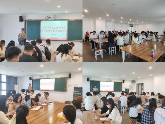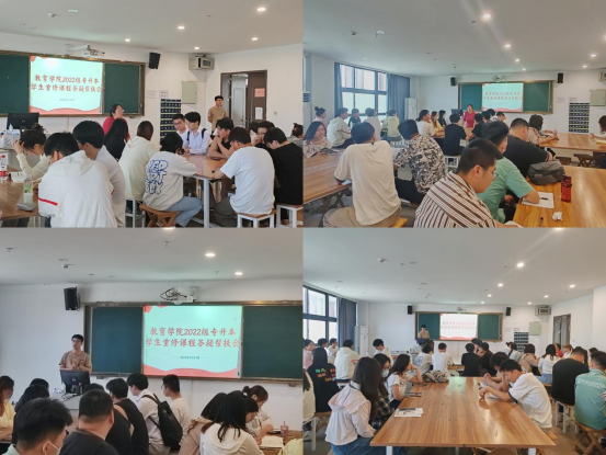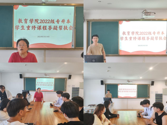 为做好2022级专升本学生重修课学习心理建设,引导学生理性对待重修,力促学生顺利完成学业。2024年5月14日中午,教育学院在艺术楼208教室组织了“2022级专升本学生重修课程答疑帮扶”活动,学院副书记孟向红、院长助理米玉、团总支副书记许海涛、各专业教研室主任(副主任)及相关课任老师参加了帮扶答疑活动。
