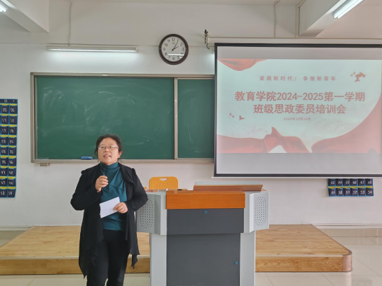 为进一步加强大学生思想政治教育工作,提高班级思政委员的业务能力和综合素质,进一步拉近师生距离,高效、动态掌握学生思想状况,10月16日下午2时,教育学院在2号教学楼423室召开学院班级思政委员培训会,会议由教育学院书记助理黄莹莹主持,分管副书记孟向红、全体辅导员老师以及116个班级思政委员参加会议。