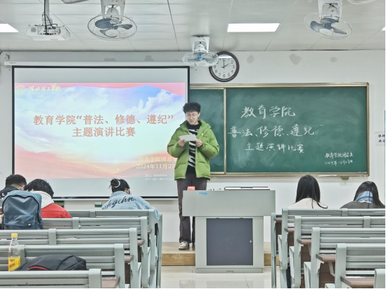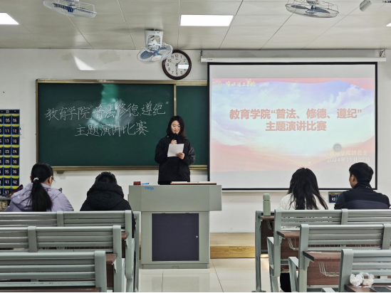 为落实学校“关于开展2024年‘普法、修德、遵纪,创建文明校园'专项活动的通知”精神,促进同学们更好地做到“学法懂法守法”,让立德树人理念更加深入人心,教育学院于11月27日在1号教学楼206、207教室举办“普法、修德、遵纪”主题演讲比赛。此次比赛由2024级班主任老师担任评委。