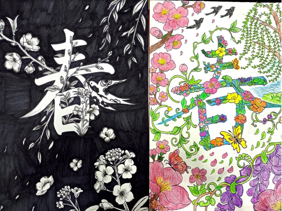 “一笔春色”活动要求同学们以“春”字为创作核心,可以利用春天的各种花草植物进行艺术创作,且作品要有原创行、内容积极向上。从收集到的作品看,同学们在创作中构思巧妙、创意新颖,他们或将“春”字笔画化作柳枝、桃花、飞燕等春日意象;或以渐变撞色铺陈底色,让“春”字与繁花、绿草共生,尽显色彩层次;或将学子的青春情怀融入字间,点缀风筝、萌趣图案,传递青春气息;还有一部分作品还采用了环保材料创作,传达了环保、绿色的理念,贴合了“春”字的主题与教育情怀。