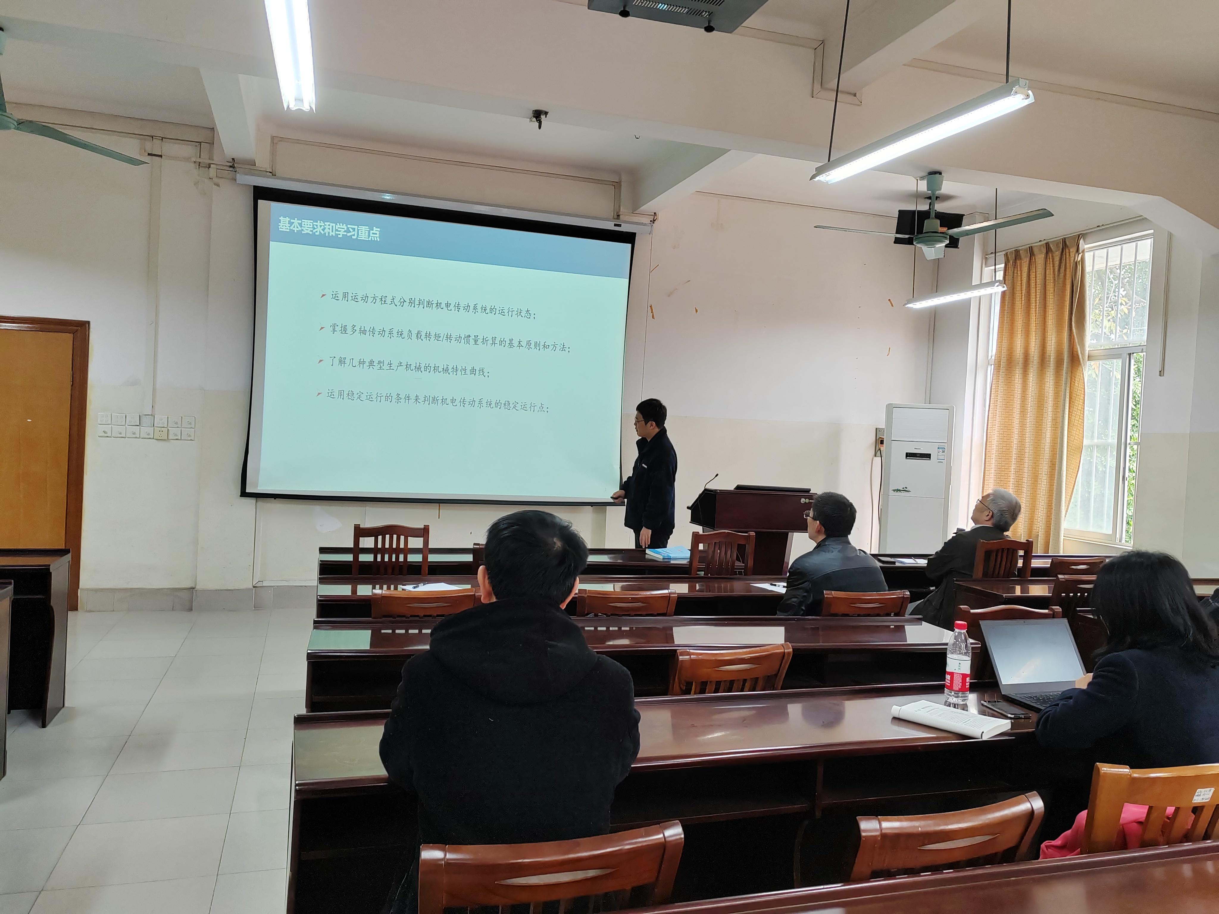 近两年新入职的项载毓、刘黎明、李琴、陆志恒、徐敏敏、盖倞尧、李宏伟、周柱坤、梁科、唐伟力、梁立喆、莫唐明、李嘉宝、董天云和魏伟等15位新教师分成3个小组,通过多媒体手段,分别试讲了《工程制图(非机类)》、《互换性与技术测量》、《工程管理与技术经济学》、《材料力学》、《工程力学(一)》、《机电传动控制》、《单片机原理及其应用》、《机械电气自动控制》、《创新设计方法与实践》、《热工学基础》、《制冷技术与原理》、《传感与检测技术》和《机械电子控制》等多门课程。