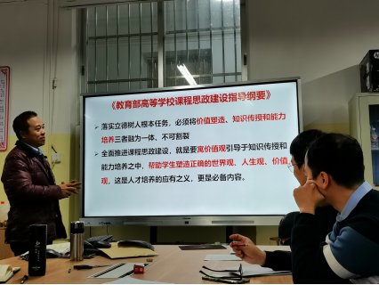 支部书记邓建新老师首先带领大家学习了习近平总书记关于课程思政建设的重要指示、《教育部高等学校课程思政建设指导纲要》等文件,以及专家对课程思政的解读。强化了“培养什么人、怎么培养人、为谁培养人”这个教育根本问题和标准,使大家在深刻理解课程思政的要求的同时,了解课程思政的常规内容、表现形式等,以指引大家更好、更广泛地寻找和挖掘课程思政素材和丰富课程思政的形式。