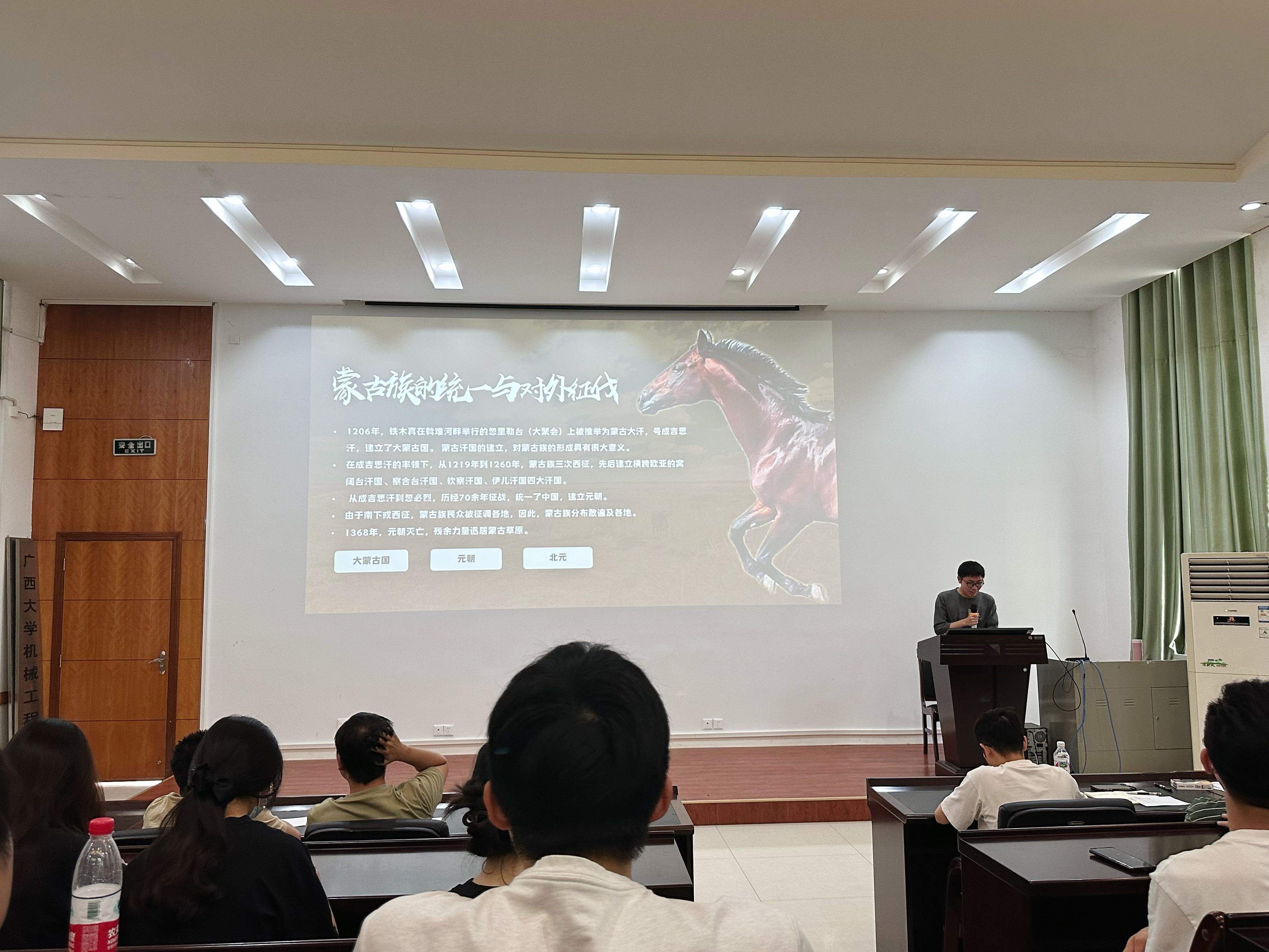 参赛队员们制作了精美的PPT展示各民族风采,6支队伍先后对瑶族、苗族、壮族、汉族、满族和蒙古族等6个民族进行了多方面的介绍,包括历史背景、人口分布与居住环境、语言文字、服饰文化、饮食特点、社会生活等等。参赛队员们通过现场问答、播放宣传视频等方式和党员们频频互动,现场气氛既严肃又活泼。