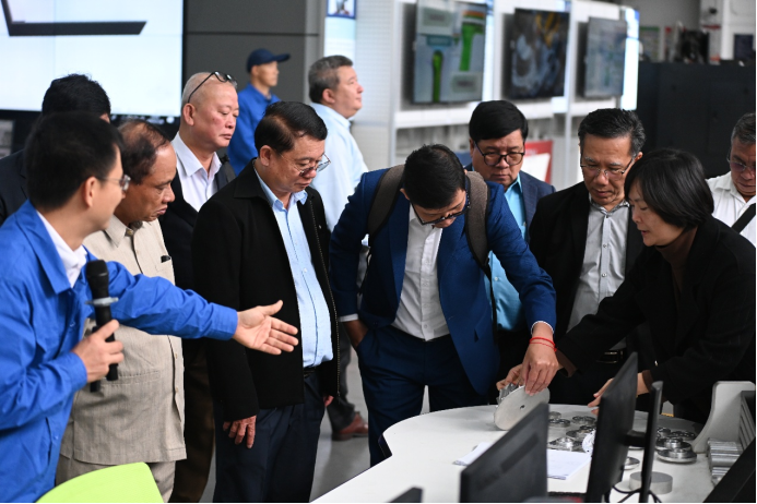 柬埔寨教育代表团走进广西大学智慧车间,全面了解工程训练中心基于工程训练所开展的教学、科研、高技能人才培训以及科普教育等概况,观看智慧车间的数字化信息管理系统、柔性生产线、五轴数控加工、智能分拣等完整智能生产流程。各位来宾对智慧车间的设施配置和教学应用表现出浓厚兴趣,频频驻足,就设备运行、零件生产等问题与我院教师进行交流,对广西大学在人工智能领域的建设成效给予高度评价。
