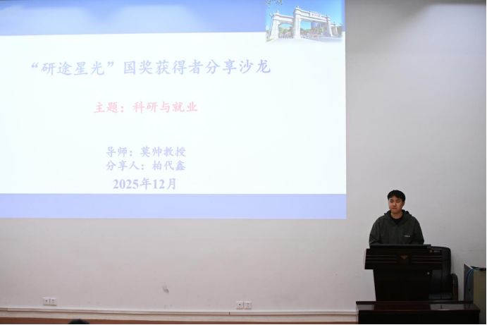 12月18日,由校研究生会主办,我院研究生会承办的广西大学第42期“研途星光”主题沙龙活动在机二阶教室举行。本次活动邀请了学院2025年研究生国家奖学金的获得者、博士研究生吴金鑫、柏代鑫、龚玉滨,分别围绕科研规划、论文写作、求职技巧及工作平衡等方面进行经验分享。学院分管研究生副院长莫帅受邀出席活动并作指导。