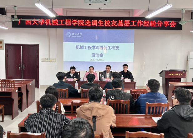 12月6日下午,我院在机械楼报告厅举办选调生校友基层工作经验分享会。本次分享会邀请到我院2019届校友赵智雄、2025届校友廖家强和梁膳攀三位选调生代表返校,为在校生传经送宝。院党委副书记黄路明、负责就业工作辅导员曾祥喜及在校学生代表参加座谈交流。